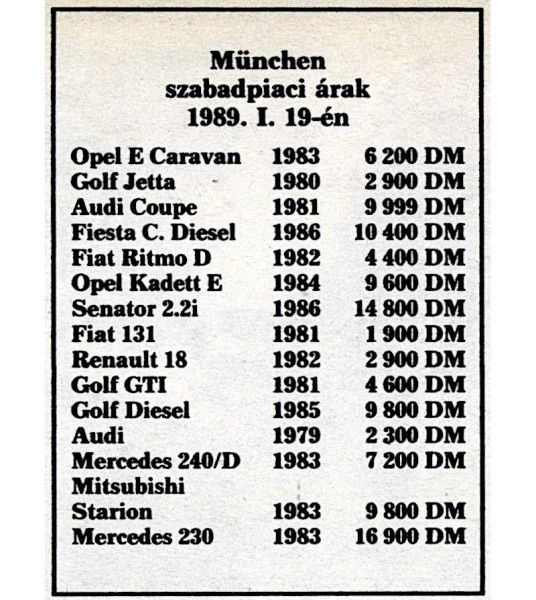A piac bejáratánál rádióriporterek. A Bajor Rádió, no meg a müncheniek kedvelt „Gong” adója várja a magyarokat. Ez a második januári hétvége volt ugyanis a premierje egy magyar utazási iroda új szolgáltatásának, az „egyenest a szabadpiacra”-programnak. Egyszer csak megszaporodik a magyar szó, a rádióriporterek csapata lecsap az újonnan érkezőkre. A túra szervezője magabiztosan nyilatkozik; hetente lesz lehetőség járatokat indítani. Az utasok mindenesetre óvatosan nézelődnek. Itt szerencsére nyelvi akadályok nehezítik a vizsgálandó jármű lebecsmérlését, s nemigen illik hozzányúlni a kocsihoz sem. A túra egyik idegenvezetőjét kérdem, hány potenciális vásárlót hoztak. Mint utólag kiderült, a busz fele már saját autón tért haza. Ezek szerint mégis csak van itt magyarnak való, már ami a pénztárcát illeti. Az én szívem is megfájdult, amikor megláttam a német szóval „totgepflegt”, vagyis halálra ápolt, csodálatosan karbantartott Volkswagen dízelt 2400 márkáért. Csak épp a felső sort, azt tudnám feledni! Ott ugyanis szerepelt a gyártás dátuma: 1981. Ez pedig azt jelentené, hogy…, nem folytatom. Attól tartok, más is kísértésbe esne.