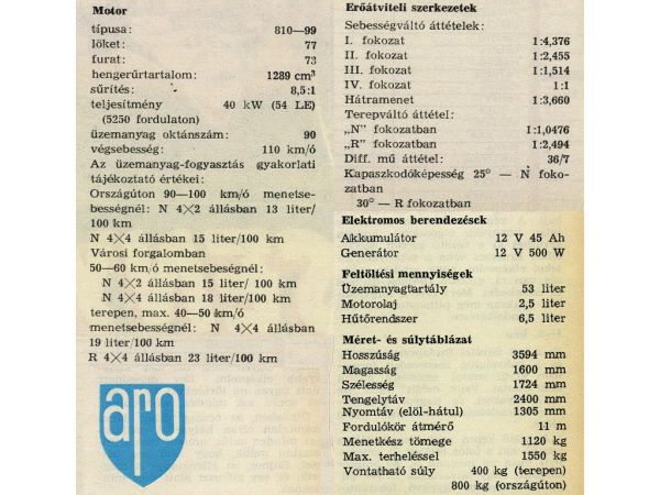 Mivel terepjáróról, tehát kedvezőtlen időjárási és útviszonyok között is üzemeltethető kocsiról van szó, fokozottan hiányzik a differenciálműzár. Ennek hiányában laza, homokos, sáros talajon a terepjáró képesség más típusokhoz viszonyítva kedvezőtlen. Most pedig ismertetjük a lényegesebb mérési műszaki adatokat, amelyek közül néhányat nem közlünk, mivel ezekre vonatkozóan a gyár összehasonlító értékelést elősegítő adatai nincsenek birtokunkban.