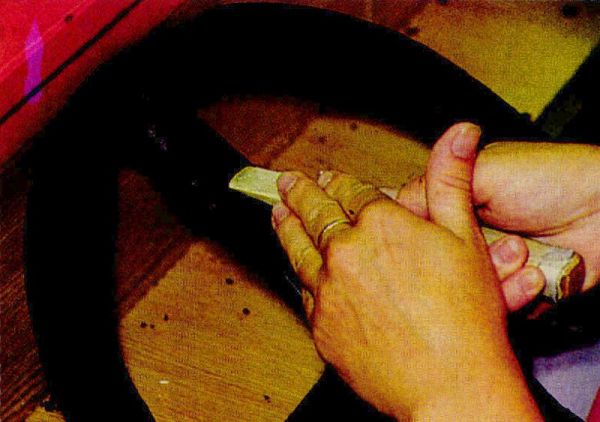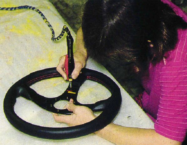 Mielőtt a méretre vágott bőrcsík a kormányvázra kerülne, jócskán akad vele tennivaló. Először is a bőr-összeillesztési felületet ellentétes irányban vékonyítják, hogy ragasztás után látni se lehessen, hol találkozott a bőr két vége. A bemetszett részt kézzel igazítják és utánfestik, majd szakavatott kezek felpróbálják, s végül ragasztás után felhelyezik a bőrt. Ez a legkeményebb munka, egész nap a rugalmas, erős anyagot feszíteni, illeszteni csak férfi képes. Ahogy sorra járjuk a munkahelyeket, pontosan látható, meddig tart a fizikai munka túlsúlya. Az első néhány munkafázist csak férfiak végzik, a befejező műveleteknek otthont adó asztaloknál viszont lányok, asszonyok ülnek. A bérek is követik a terheket, aki géppel ragasztót ken a bőrre, 17 ezer forint körül keres, a bőrt a kormányra feszítő munkás 25 ezer forint körül. Ha arra gondolunk, hogy Komárom megyében mekkora gond a munkanélküliség, nem rossz pénz. De ha arra, hogy egy MOMO-kormány ára alig jön ki egyhavi bérükből…