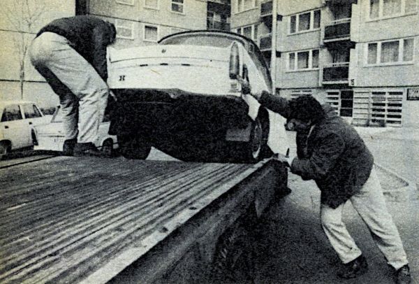 A második jelölt, egy viharvert Trabant – ugyancsak a X. kerületben, a Vásárló utcában – már nem kerül el a sorsát. Noha kesztyűs kézzel bánnak vele (a szó szoros értelmében), majdnem darabjaira esik szét, amíg a csörlő a platóra vontatja. A számla végösszege 573 forint, amihez hozzájön még a 40 forintos napi tárolási díj. Ha a tulajdonos nem jelentkezik (ezért aligha fog), a teljes költséget a Fővárosi Tanács fizeti majd ki a Főspednek.