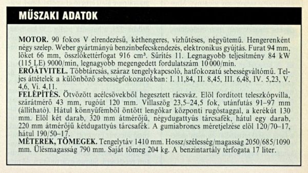 – Nekem legalábbis nagyon megfelel. A hosszában elhelyezett V-motor miatt sokkal keskenyebb, mint a keresztben elhelyezett soros négyhengeresek. Ezért jobban lehet térddel fogni, és jobban is dönthető. A másik, a kis CBR 7500-7600/min fordulatszámig nagyon harmatos. Afelett aztán egyszerre szakad fel belőle az erő. Ezt a fajta karakterisztikát én nem szeretem. A Ducati szinte az alapjárattól, kétezertől kegyetlenül húz.