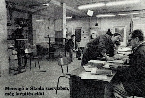A Miskolci úti szervizben már Lada Szamara is előfordul, itt tehát nehéz lenne hivatkozni arra, hogy csak avítt típussal foglalkoznak. Igaz viszont az is, hogy régen a szakma kiváló mestere lehet az az autószerelő-tanonc, aki szurtos kezét itt a falba törölte, mindjárt a váró bejáratánál. Egyébként a büfé miatt eléggé összekeveredett funkciójú itt az ügyfélváró. Van ugyan színes tévé szkáj csatornával, meg szkáj fotel. Az összképet csak kissé rontja, hogy ha a büfés mondjuk kávét darál, a képből csak a csík látszik, s az ülőgarnitúrák felületének fényessége sem fogható csak műbőr voltukra. Itt is némi bútorraktár jellege van az ügyfélvárónak, irodatechnikai bemutatóval tarkítva, ugyanis itt tárolják a leselejtezett könyvelőgépeket. Bizonyos megértéssel vélekedhetünk arról, aki megterveztette az ügyfélváró színeit: ez a kaszárnyába illő színkompozíció könnyebben illeszkedik a szerviz egészéhez. Sajnos, ma még mindig olajpalabányászhoz hasonlít a honi autójavító ipar színe-virága, amikor dolgozik. Nehezen tudom elképzelni őket, mint számítógép-vezérelt automobilok karbantartóit.