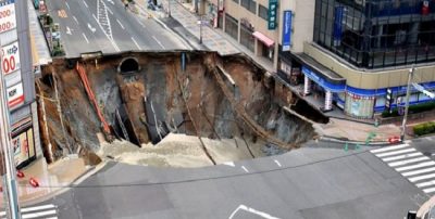 Óriási víznyelő szippantotta magába az úttestet Fukuokában (videó)