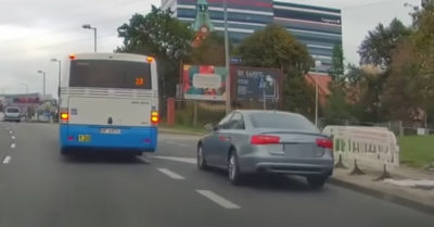 Az Audi a járdáról akarta megelőzni a buszt, csak épp az oszlopra nem számított… – VIDEÓ