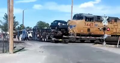 Nem figyelt a sofőr, fent maradt a sínen a tréler vége, és jött a vonat… – VIDEÓ