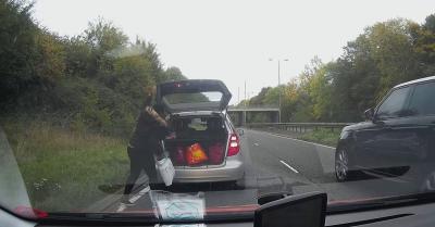 Ilyen őrültet még nem láttál: az autópályán állt meg, hogy pakoljon a kocsiban – VIDEÓ