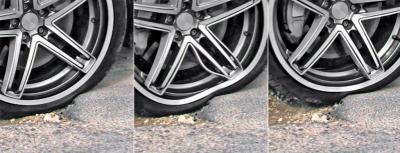 A nagy átmérőjű felnire szerelt alacsony oldalfalú abroncsok túlélik a kátyún való áthatjást a Michelin fejlesztésének segítségével.