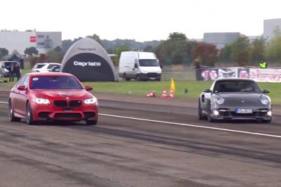 Repülőrajtos gyorsulási versenyen mérkőzik egy 750 lóerős BMW M5 Gorilla Performance és egy 950 lóerős 9ffPorsche 911-es - több-kevesebb sikerrel.