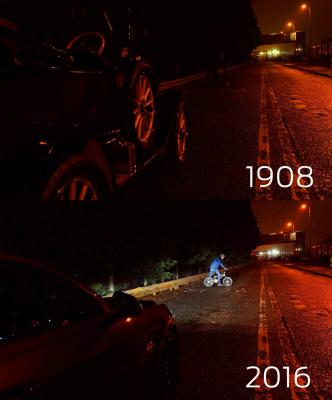A Ford hat autóval, azonos körülmények között bizonyítja, mennyit fejlődött a világítástechnika 109 év alatt.