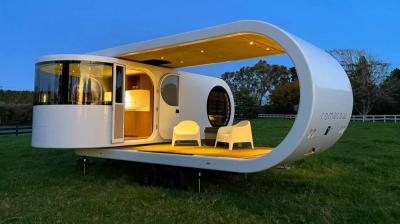 A Romotow nevű lakókocsi különlegessége, hogy a lakótér elfordításával méretes fedett terasz jön létre.