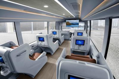 Egyéni munkaállomások mellett tárgyaló és pihenőzóna is elérhető a Universe Mobile Office luxus irodabusznál.
