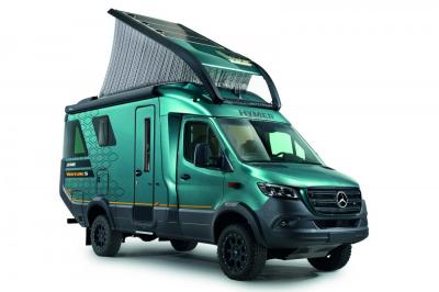 A Mercedes-Benz Sprinter alapján épített Hymer Venture S kempingautó különlegessége a lenyitható, bambusz borítású hátsó terasz.