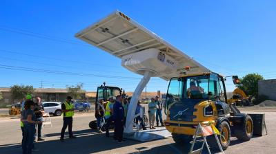 A Volvo Construction Equipment az akkumulátoros-elektromos járművei mellé kínálja a Beam Global könnyen telepíthető napelemes töltőjét.