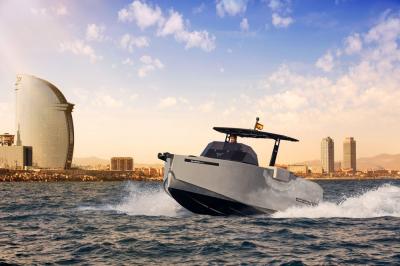 A De Antonio Yachts nevű hajtóépítő D28 Formentor e-Hybrid motorcsónakja kikötőben villanymotorral halad, egyébként 400 lóerő repíti.
