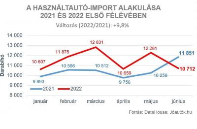 2022 első félévében a Datahouse adatai szerint 68 965 import használt személyautó került hazai forgalomba Magyarországon, ami a tavalyi hasonló időszakhoz képest 9,8 százalékos növekedést jelent.