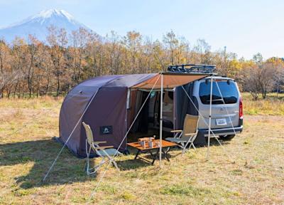 Japánban a gyári tartozékok között találjuk a felfújható vázas sátrat, amivel a kempingautó lakótere bővíthető ki.