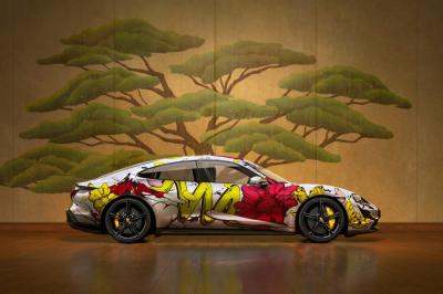 A Porsche villanymotoros modelljét népszerűsítő Taycan Soul Canvas kiállításra készítette el Shun Sudo az egyedi festésű kupét.
