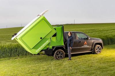 A német Flip90 cég ötlete a hátrafelé leforduló modullal kiegészített lakókocsi vagy pickup doboz.
