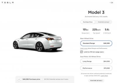 151 km-es hatótávolsággal is választható a Tesla Model3