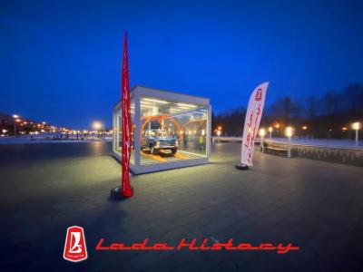 A Lada History nevű rajongói klub készítette el az üvegkalitkába zárt, a gyári szerelőszalagon lógó 2101-est mutató alkotást.