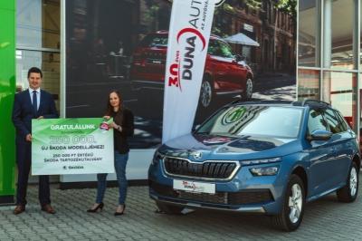 A jubileumi autó egy titánkék Škoda Kamiq 1.0 TSI Ambition 13 különféle extrafelszereltégi elemmel, amelynek mostantól egy budapesti kétgyerekes családanya a boldog tulajdonosa.