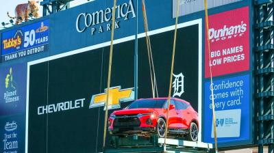 A Detroit Tigers stadionjában kiállított, Mexikóban gyártott Blazer szabadidő-autó ellen tiltakozott a UAW szakszervezet.