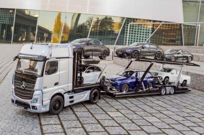 113 centi hosszon nyújtózkodik és 10 kg a tömege a legújabb Mercedes-Benz modellautónak, ami egy autószállító tréler.