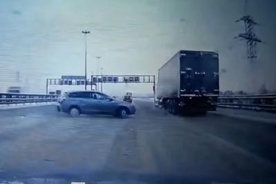 Centiméteres pontossággal csúszik be a félpótkocsi alá a jeges úton megpördülő Lada Vesta.