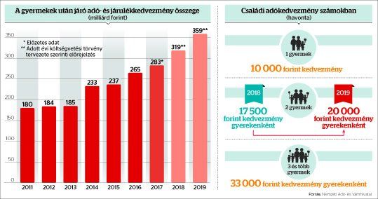 A kormány egyik legfontosabb irányváltása, hogy a korábbi – alanyi jogon szétszórt – támogatásokat már a munkavállaláshoz kötötte. Ennek egyik legjelentősebb lépése volt az adórendszer átalakítása, amelynek a családi adókedvezmény adja napjainkban is a gerincét. A kormány jelentős adókedvezményt ad a gyermekeseknek. Minél több gyermeket vállal a család, az adókedvezmény mértéke annál nagyobb, minél több gyermeket vállalnak a családok, munkabérüket annál kisebb mértékű elvonás terheli. Ennek köszönhetően mára 130 ezer munkavállalónak már egyáltalán nem kell adó- és járulékterhekkel számolnia, 2011 és 2017 között pedig összesen 1572 milliárd forintot hagyott az állam a családoknál.
