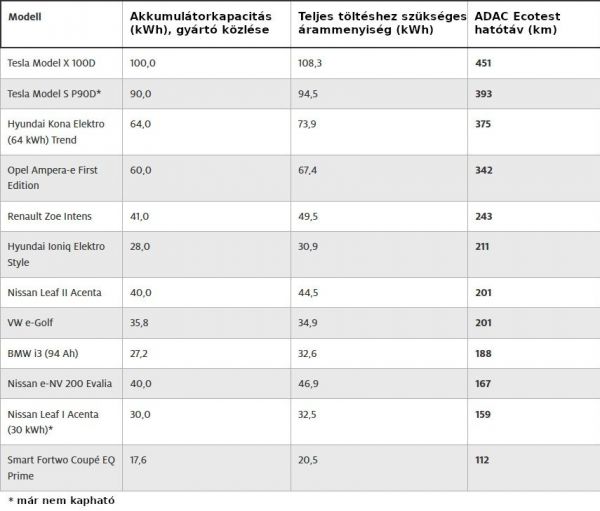 Tizenkét villanyautót vizsgált meg az ADAC az Ecotestjén, kifejezetten arra voltak kíváncsiak, hogy mekkora hatótávolsággal rendelkeznek a villanyautók, és hogy ténylegesen mennyi energiát igényelnek. Utóbbiba beleszámít a töltési veszteség is, azaz a névleges kapacitásánál több energiát kell beletáplálni a telepbe ahhoz, hogy az teljesen feltöltődjön – mintha tankoláskor az aszfaltra locsolna az ember benzint vagy gázolajat. A Németországban megvásárolható legnépszerűbb elektromos autókat vizsgálták, a Renault Zoétól kezdve a Tesla Model S-ig; az eredmény közreadásakor több autó már nem volt megvásárolható.