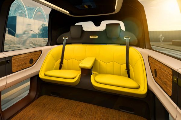 Az akkumulátorcsomag a tengelyek között, a padló alatt helyezkedik el, a villanymotor a tengely vonalában, az egyéb technika (vezérlőelektronika, érzékelők, stb.) pedig az autó négy sarkán lévő tetőoszlopban található, ennek ellenére nem négy, hanem csak 2+2 személyes a beltér. Itt csupa természetes anyagot használtak, bőrt meg fát, nincs külön monitor, hanem az első szélvédő az alaphelyzetben átlátszó kijelző, amelyet menet közben használhatnak az utasok.