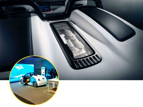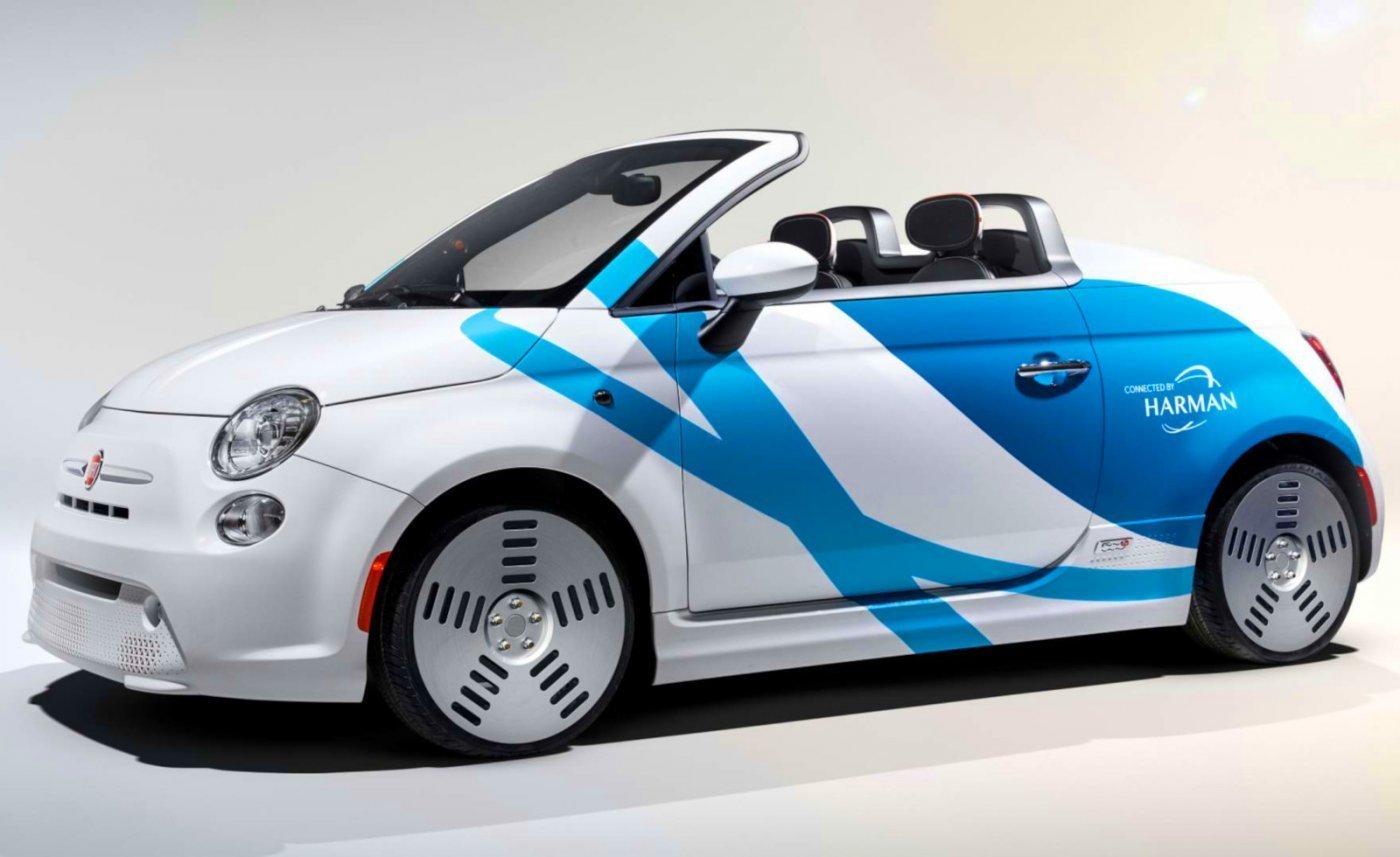 Önvezető autó érzékelőket (3-as szintű haladást tesz lehetővé) rejtenek a Harman International által átalakított Fiat 500e lökhárítói, ezeket úgy sikerült elhelyezni, hogy nem is látszanak. Az utastér tele van JBL kütyükkel (fejtámla-hangszórók, vezetőt figyelő kamera, amely élettani jeleket is vizsgál az érzelmi állapot megítélésére), a gyári műszerfal helyére egy hatalmas monitort helyeztek. Mindez mellékes, hiszen egy autórajongónak az a lényeg, hogy roadstert faragtak a miniautóból.