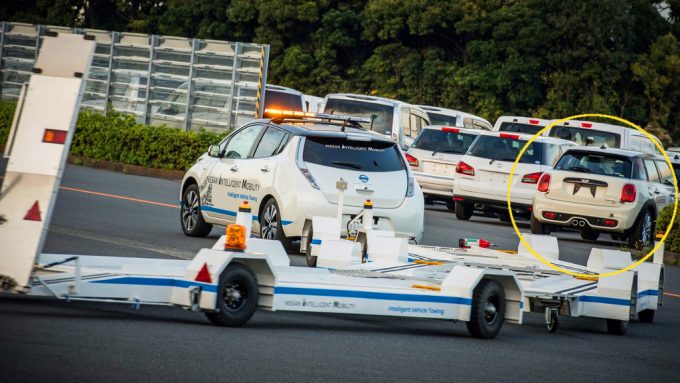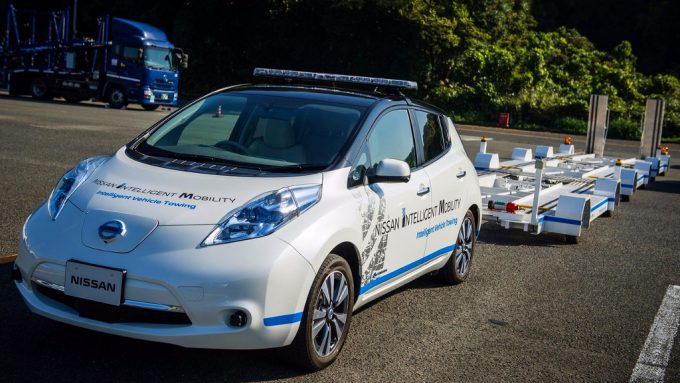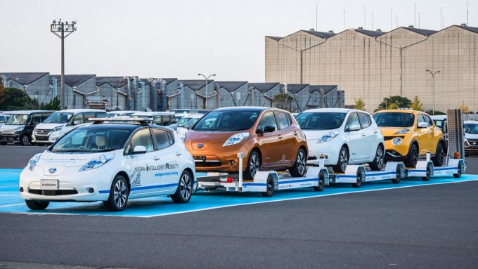 Hivatalosan csak most veszik át a gépek az emberi sofőrök szerepét a Nissan oppamai üzemében, ahol önvezető technológiás Leafeket vet be a már elkészült autók tárolóba szállítására, már egy éve folyik a próbaüzem – ezidáig 1600 sikeres utat teljesítettek az egyszerre három autót vontató szerelvények, úgyhogy a jövőben ezek váltják ki az embereket.