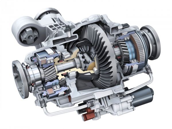 Íme, az Audi S8-as hátsó differenciálműve! Alapesetben a nyomaték 40%-a jut az első tengelyre, de bizonyos esetekben a vezérlés akár 70%-ot juttathat előre, és akár 85%-ot hátra.