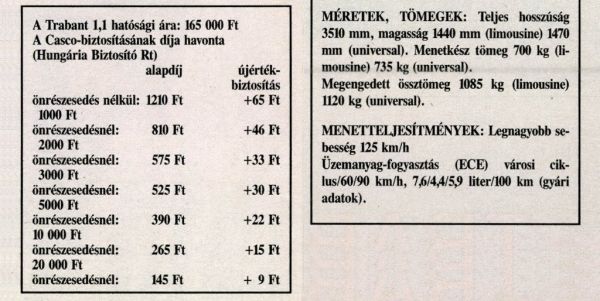 Ami igazán nem nyerte meg a tetszésünket, az az átadó telepeken sorakozó Trabantok és a gyári tesztkocsi felszereltségének eltérése volt. A Magyarországra szállított autókból hiányzik ugyanis a hátsó biztonsági öv, az első ködfényszóró és kapcsolója, s a 155/70-es gumik is csak 1000 forint többletfizetés mellett kérhetők, ha egyáltalán a kiválasztott színű autók között található ilyen.