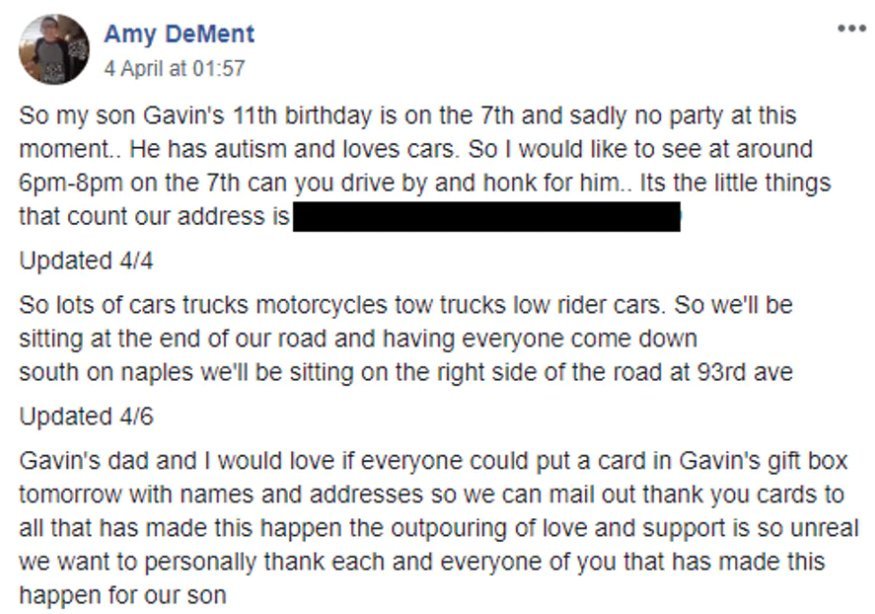 Édesanyja tudta, nem egyszerű a feladat, hiszen nem mehetnek sehová a járvány miatt, így kiírta a Facebookra, hogy ha esetleg valaki a nagy napon arrafelé jár, amerre ők laknak, tegye meg, hogy dudál egyet, hátha ezzel legalább egy kis örömet tudna okozni a fiúnak a születsénapján.