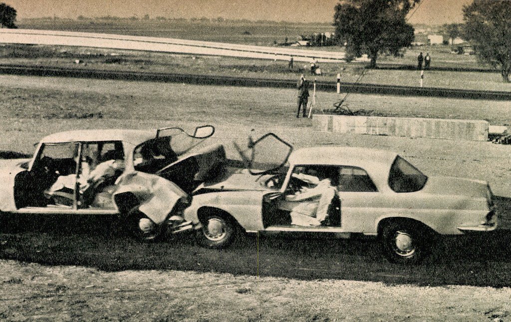 Amikor szakmai körökben nálunk is bemutatták azt a filmet, amely a Mercedes kocsik egész tucatjának szándékos, mesterséges összeütközéseiről készült, valamennyiünkre rendkívüli hatást gyakorolt a látott kísérletsorozat. Hallani lehetett az éppen összeroppanó fémek csattanását, dörejét, a kipattanó üvegek csörömpölését, de itt az emberi hang, sikoly, jajszó nem borzolta az idegeket. Élettelen bábuk ültek a kormány mögött és ugyancsak műanyagbabák foglaltak helyet hátul is a kocsikban. Talán ennek a tudata engedte, hogy ha komolytalanul is, de előtolakodjék a gondolat: nem kár így összetörni ezeket a jó kocsikat?