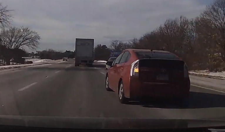 Három sávon zúg keresztül a piros Prius, csak hogy megkerüljön egy kamiont. Ám a karma ezúttal gyorsan lecsapott.