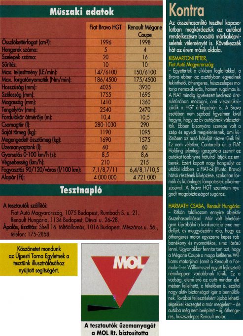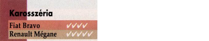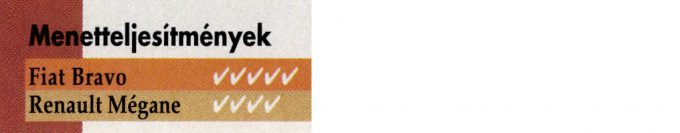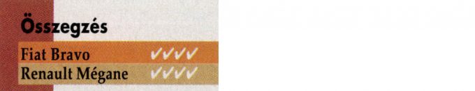 A közel azonos felszereltség mellett a Fiat sokkal kedvezőbb áron kínálja portékáját, s mivel a lökkettárfogatból azonos nagyságú közterhek adódnak, lényegesen jobb vételnek tűnik a Bravo, még akkor is, ha az értéktartás szempontjából a Mégane némileg „lassabban kopik”.