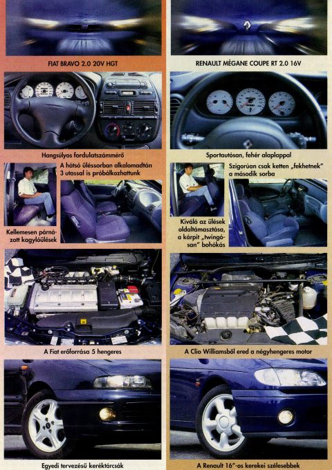 Aki ilyen jellegű autó vásárlására adja a fejét, az valószínűleg cseppet sem mérlegel, nem veszi figyelembe például a csomagtartó nagyságát, sem azt, hogy hányan, hogyan férnek el a hátsó sorban. Csak egyvalami érdekli: a forma, amelynek önmagáért kell beszélnie. A két kocsi közül az első látásra paprikás kinézet feltételének a Renault Coupéja sokkal inkább megfelel, hiszen a meglehetősen kicsi hátsó kinyúlás miatt az autó vonalvezetése egy bulldoghoz hasonlítható, így már messziről sugározza a harcias tulajdonságokat. A Bravo valamennyi GTI elvárást magán hordozza, hiszen légterelők, könnyűfém keréktárcsák, apró kopoltyúk jelzik a hétköznapitól eltérő kivitelt, mégis talán szorosabb rokonságban áll a mezei változatokkal. A szokványos vizsgálati pontokhoz visszatérve a Fiatnál 5 személy szállításával is foglalkozhatunk, ezzel szemben a Renaultban maximum 4 fő utazhat. A hátsó üléssort ugyanis kizárólag két utas részére képezték ki. A csomagtartó nagysága közel azonos, a Coupe meglehetősen nagy terén sokat kicsinyít a szűk nyílás.