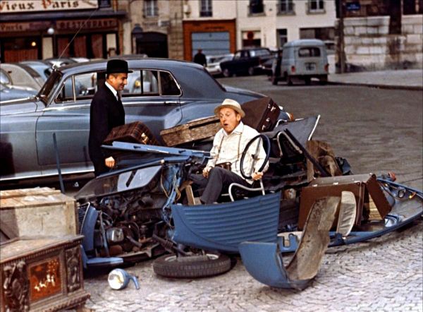 Gérard Oury fordulatokban bővelkedő filmje egy hosszú autós jelenetfolyammal kezdődik. A főszereplő és sofőrje egy fekete Citroën DS-szel és a tetején egy csónakkal tolakszik előre a zsúfolt forgalomban, végül egy óvatlan pillanatban letérnek az útról és a vízbe pottyannak, a csónak pedig helyet cserél az autóval…