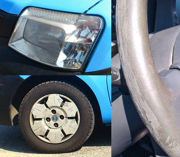 A műanyagokon látszik az idő múlása, matt a bura, hámlik a dísztárcsa A fényképeken szereplő autó is ilyen, annak ellenére, hogy a parkolási sérülésektől mentes az autó, bizony, meglátszik a kor a műanyagokon. A fényezetlen fekete hátsó lökhárító foltos, némely dísztárcsáról (a bal első és a két jobb oldali) nagy foltokban jön le a fényezés, a műanyag fényszóróbura pedig lassan polírozást kér. Az utastérben a kormánykarimán, ahol nyugalmi helyzetben pihen a sofőr keze, hámlani kezdett a felső réteg, a kormány közepénél pedig a festék kopott meg a márkajelzés körül. Ezek csak a látványt, és nem a működést befolyásolják, ellenben hamarosan csereérett lesz a hátsó kipufogódob. Hátulról nézve meglepően friss és üde a dob, azonban a kerékjáraton bekukkantva már látszik, hogy inkább percek, mint órák kérdése a lyukadás – ez a rövid távon használt autók általános jellemzője. Az alkatrészárak kedvezők, a javítás egyszerű, úgyhogy a karbantartás költsége sem veri az eget.