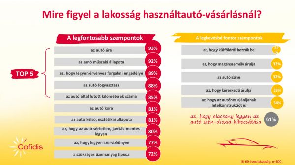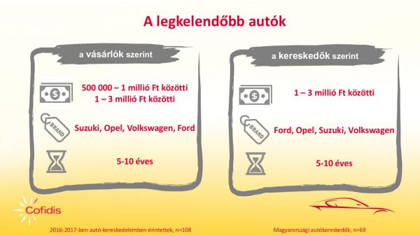 Természetesen alaposan felmérték a használtautó-finanszírozási piac állapotát is, 70 autókereskedő és 500 18-69 év közötti magánszemély megkérdezésével végzett kutatást az NRC Marketingkutató és Tanácsadó Kft. Évek óta folyamatosan emelkedik azoknak az embereknek a száma, akik autóvásárlást terveznek, 2017-ben 14 százalék nyilatkozott így. A teljes piac 86 százalékát jelenti a használtpiac, ezen belül 22 százalék gondolkozik finanszírozásban, a piacon két nagy árkategória van, az 500 ezer-1 millió Ft és az 1 millió-3 millió Ft. Legfontosabb döntési szempont a műszaki állapot, legszívesebben egy hozzáértő szakival mennek az emberek használt autót vásárolni. A külföldi származás nem riasztja el őket, hiszen ez alacsonyabb vételárat jelent – egészen pontosan megdrágultak az új koruk óta Magyarországon futó és karbantartott autók -, de a külföldi eredetű jármű megvásárlása után jobban izgulnak. Annyiból kényszerhelyzet ez a magyar autópiacon, hogy a válság idején elapadt a hazai utánpótlás, amelyet muszáj más forrásból pótolni.