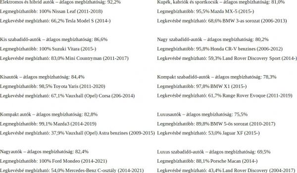 Összesen 27 autómárka 139 típusa vett részt a felmérésben akkora számban, hogy azokat statisztikailag értékelni tudták, három autó ért el 100%-os eredményt, az Esztergomban gyártott Suzuki Vitara, a Ford Mondeo és a Nissan Leaf (első generáció). A legrosszabb eredményt a Vauxhall (Opel) Astra benzines változata (2009-2015) produkálta 37,9%-os eredménnyel. Alapvetően látható, hogy a bonyolult és idős autókkal van több probléma, például a szabadidő-autóknál az extrákkal teletömött luxusmodellek 69,5%-os átlagos eredményt értek el, míg a kiskategóriás SUV-k (ide tartozik például a Vitara is) 86,6%-ot.