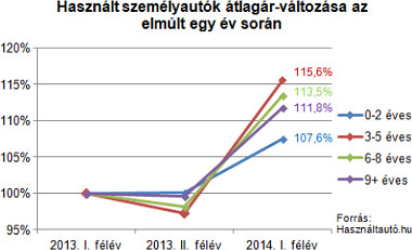 Minden korcsoportban az látható, hogy míg az előző év második felében lassú lemorzsolódás jellemezte az árakat, a vagyonszerzési illeték bevezetése óta megdrágult import felfelé nyomta a belföldön kínált használt személyautók árát is. A második félévben azonban további jelentősebb árnövekedésre már nem kell számítanunk.