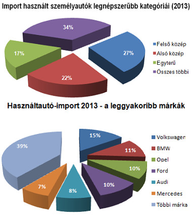 Az idén importált használt járművek fele alsó- és felső-középkategóriás személyautó volt, a legnépszerűbb hat gyártmány (Volkswagen, BMW, Opel, Ford, Audi és Mercedes) zömmel továbbra is a legnagyobb presztízsnek örvendő német márkákból kerül ki. Tavalyhoz képest annyi változás történt, hogy idén az Audik száma megelőzte a behozott Mercedesek mennyiségét.