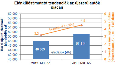 Az autópark utánpótlásának belföldi forrása, az új autók piaca eközben szintén kezd felkapaszkodni a gödör aljáról. Az idén várhatóan 56 ezer darab körül alakul az újonnan forgalomba helyezett személyautók száma, ami 5-6 százalékkal haladja meg a tavalyi értéket. Az érdeklődés jelentősen erősödött e korcsoport iránt. a Használtautó.hu oldalain idén 40 százalékkal többen kerestek rá a legfrissebb évjáratú, új vagy újszerű autókra, mint tavaly. Ugyanakkor az anyagi korlátok – a megtakarítások alacsony szintje, illetve a finanszírozás újraindulásának lassúsága – még sokáig a jelentősebb fellendülés komoly gátjai maradnak.