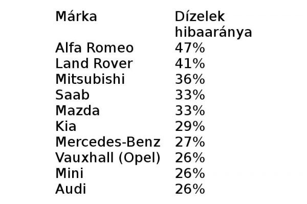 Amíg egy benzines autó megjavítására esetenként átlagosan 433 fontot (kb. 152 800 Ft) kellett fizetni, addig a dízeleknél ennél 20 százalékkal magasabb, 517 font (kb. 182 500 Ft) az átlagos javítási számla. A MotorEasy szerint ez a különbség abból adódik, hogy nagyobb nyomásokkal dolgoznak a dízelek, amely a vizsgált életkorban már igenis mérhető különbséget okoz a meghibásodások terén. A márkák 71 százalékánál több probléma van a dízelekkel, az Alfa Romeo került az élre ezen a listán, ahol négyszer nagyobb a probléma esélye dízelmotorral, mint benzinessel. Ellenkező esetben a BMW vezeti a listát, azaz a bajor gyártónál hatvan százalékkal nagyobb az esélye a benzinmotor meghibásodásának, mint a dízelnek. A legmegbízhatóbb dízelautókat egyébként a Škoda márkánál találták a tapasztalatok összesítése alapján.