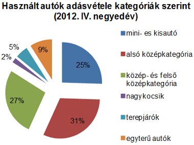 Kategóriák szerint vizsgálva a szakportál adatbázisát, a használtautó-forgalom 31 százalékát az alsó középkategóriába tartozó autók tették ki, ezek átlagára 1,09 millió forint volt. A közép-és felső középkategóriához (27 százalék) tartozó átlagár 1,84 millió forint volt, miközben a mini- és kisautók (együttesen 25 százalék) 798 ezer forintos átlagos értéken keltek el. 2012-ben az öt leggyakoribb gazdát cserélő márka sorrendben az Opel, a Suzuki, a Ford, a Volkswagen és a Renault voltak, az adásvételi szerződések több mint fele e márkák egyikére köttetett.