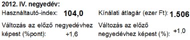 „Miközben a hazai használtautó-átírások száma 2012-ben enyhén csökkent, az importált használt személyautók száma az előző évi 31-ről közel 54 ezerre nőtt, ami ezt a visszaesést képes volt ellensúlyozni – értékeli az elmúlt évet záró adatokat Szemes Árpád, a Használtautó.hu ügyvezetője. – Továbbra is kevés azonban az újszerű autó a kínálatban: az eladások 60 százalékát legalább kilencéves autók teszik ki, ennek megfelelően az átlagár egy év alatt közel öt százalékkal 1 millió 506 ezer forintra esett vissza.”